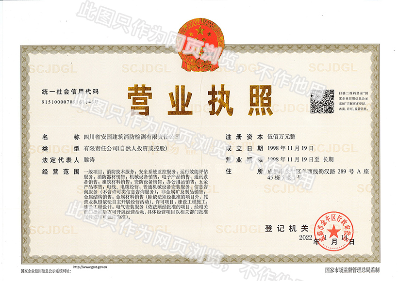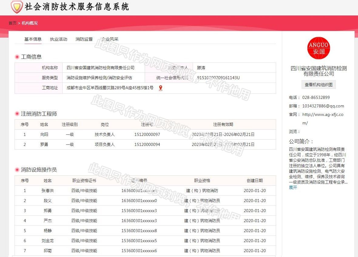 四川省安國建筑消防檢測(cè)有限責(zé)任公司,成立于1998年,經(jīng)四川省公安消防總隊(duì)批準(zhǔn),工商部門注冊(cè)的獨(dú)立法人單位。 公司具有建筑消防設(shè)施檢測(cè)、電氣防火安全檢測(cè)、維修、保養(yǎng)及技術(shù)咨詢一級(jí)資質(zhì)的中介技術(shù)服務(wù)機(jī)構(gòu),獲得CMA計(jì)量認(rèn)證。主要業(yè)務(wù)范圍是:接受建設(shè)單位或有關(guān)單位委托,承擔(dān)新建、改建、擴(kuò)建建筑自動(dòng)消防設(shè)施技術(shù)檢測(cè)、電氣防火安全檢測(cè)、以及承接建筑消防設(shè)施維護(hù)保養(yǎng),對(duì)已交付使用的建設(shè)消防設(shè)施的運(yùn)行情況進(jìn)行運(yùn)行檢測(cè),開展建筑消防設(shè)施的消防安全技術(shù)咨詢。公司設(shè)辦公室、總工辦、財(cái)務(wù)部、檢測(cè)部、維保部等職能機(jī)構(gòu),擁有一